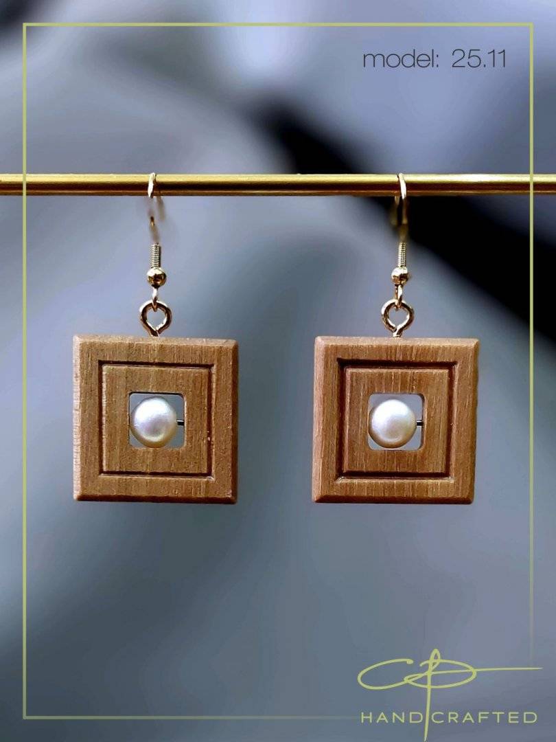 Cercei realizati manual din lemn de nuc si perla naturala de cultura.