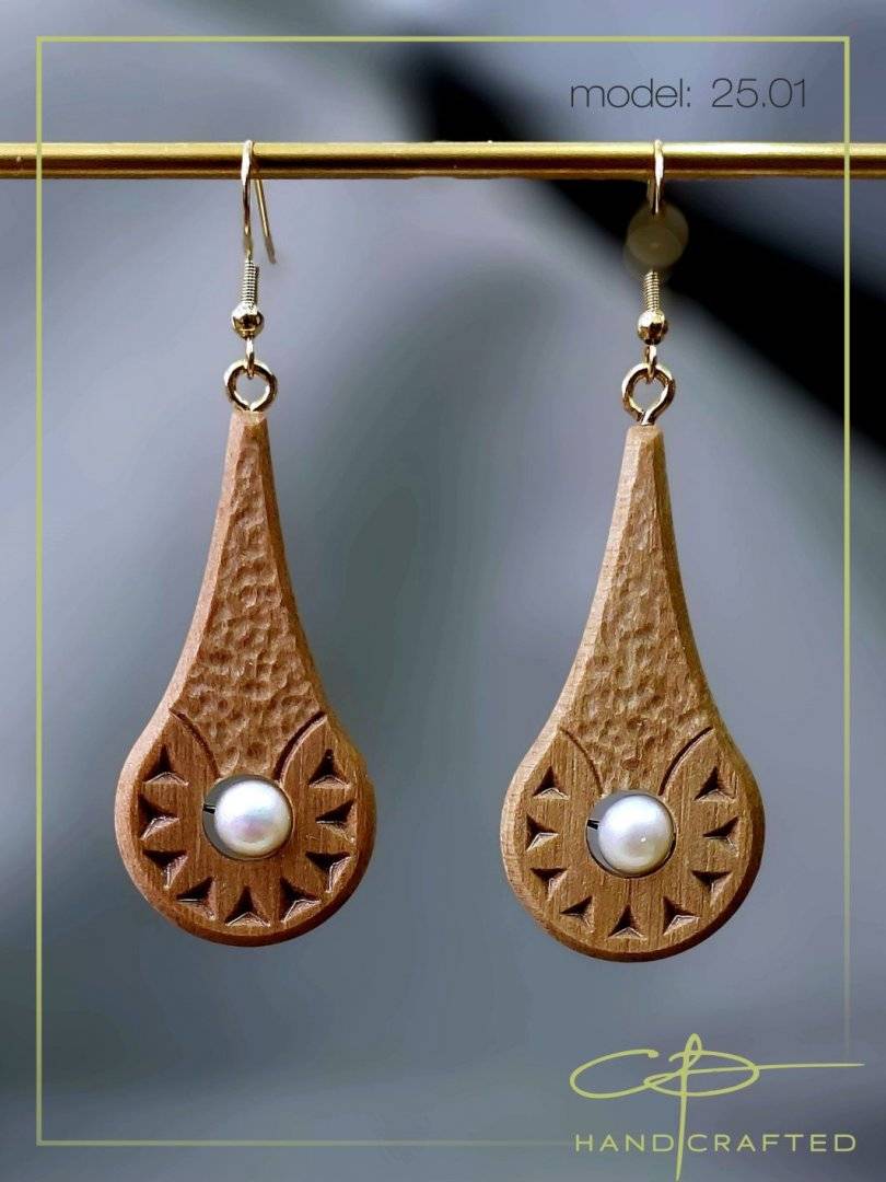 Cercei realizati manual din lemn de nuc si perla naturala de cultura.
