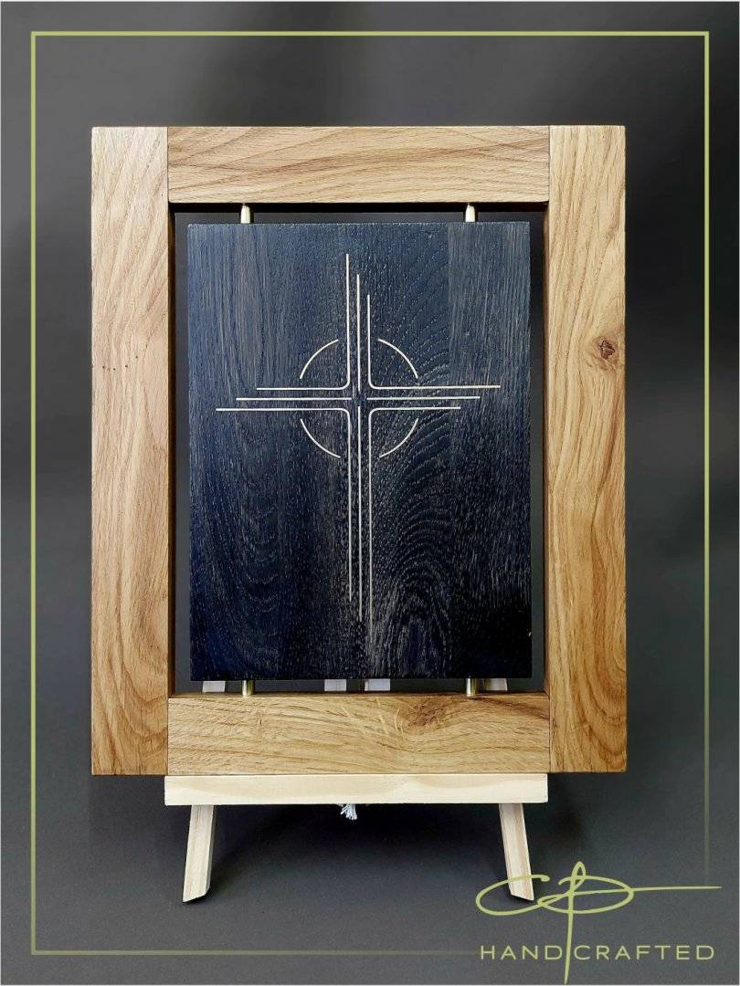 Decoratiune de arta realizata din intarsie de alama (4 mm adancime) in lemn de stajar ebonizat.