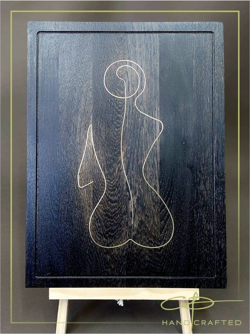 Decoratiune de arta realizata din intarsie de alama (4 mm adancime) in lemn de stejar ebonizat.