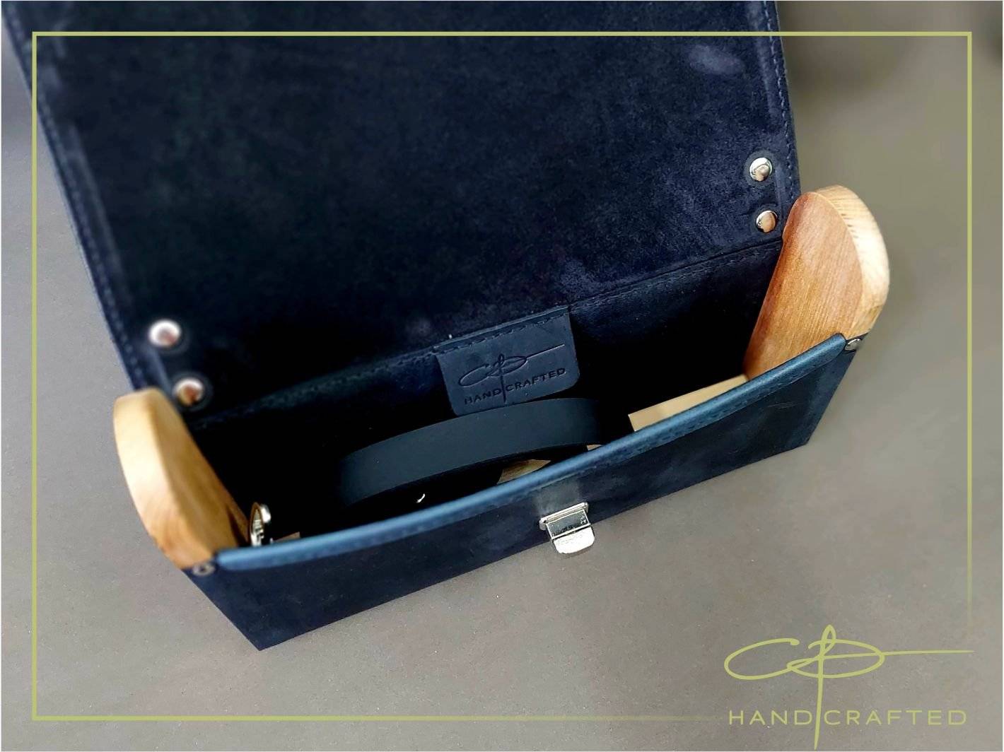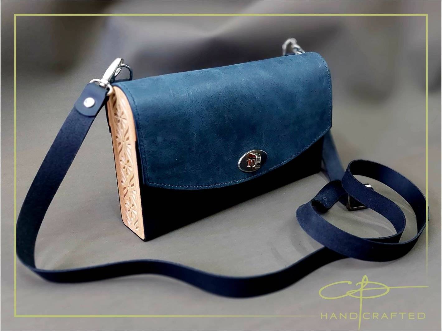 Geanta din piele naturala si lemn sculptat, lucrata integral manual.